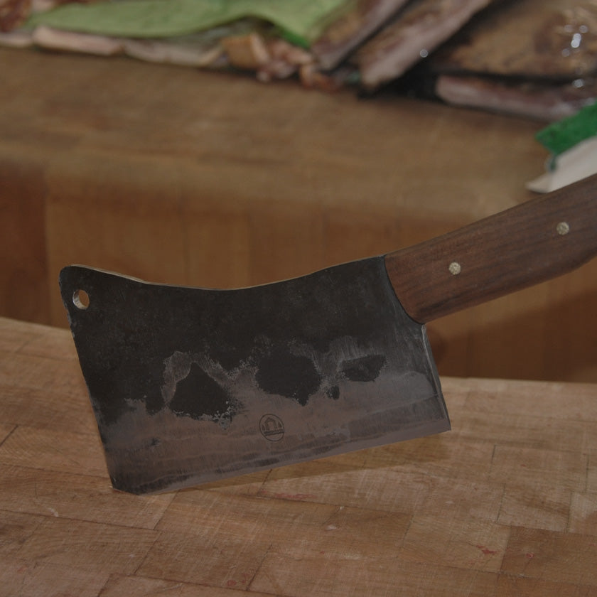 Jeff is a consummate craftsman who built for us, by hand, the world's greatest cleaver! This piece, and we call it a piece because it is a piece of art, was crafted from vintage sawmill blade and hammered into submission. This included shaping the steel in creating a samurai like edge; brilliantly sharp and incredibly strong. This beauty is presented in a hand stitched leather case which can be engraved. It is a beautiful culinary masterpiece.